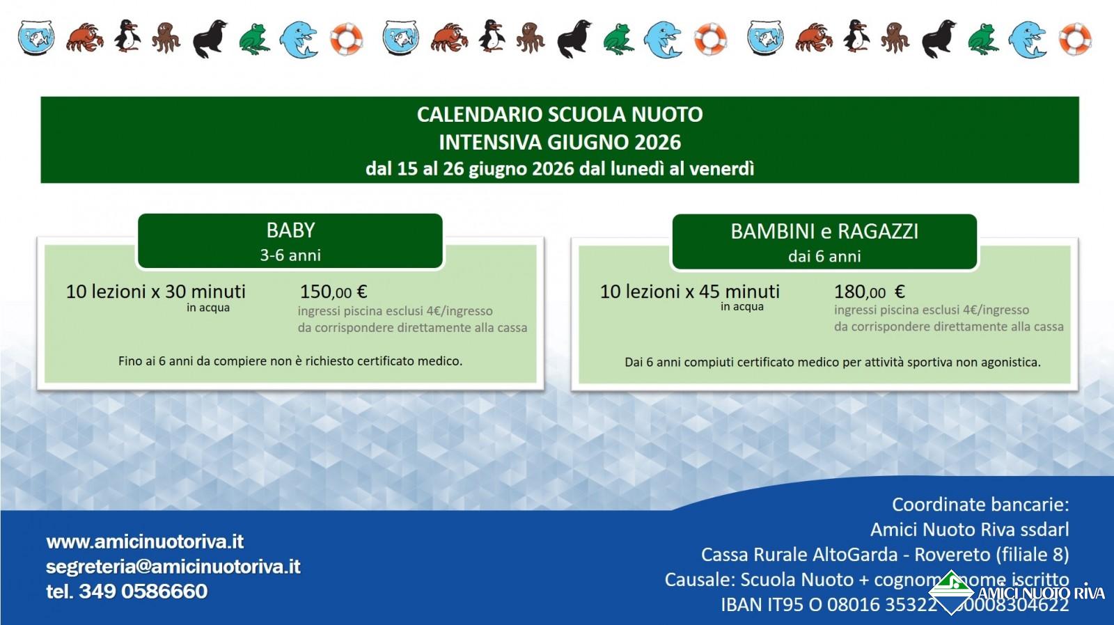 Corsi di nuoto intensivi dal 15 giugno 2026 al 26 giugno 2026, dal lunedì al venerdì fra le 16.00 e le 19.30.